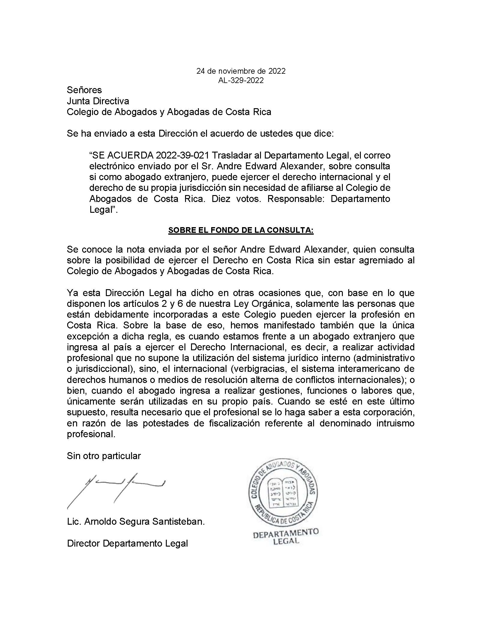 . Bar of Costa Rica, Costa Rica (CPR - Conditional Practice Rights).